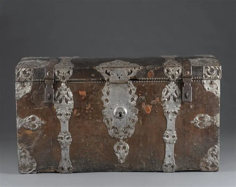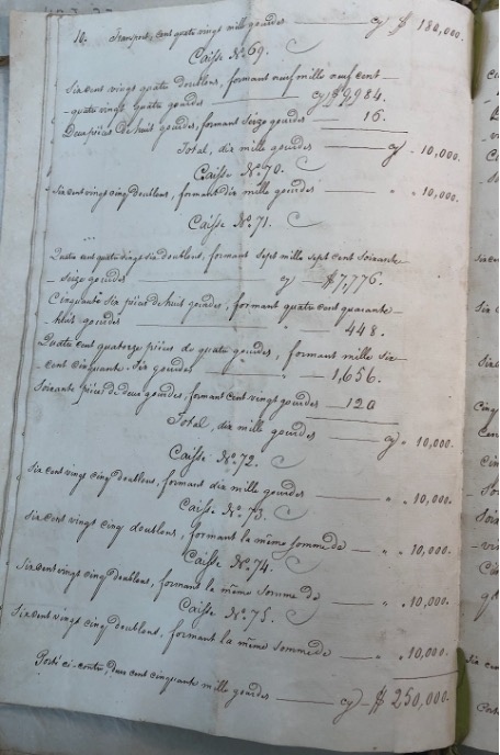 On June 26, 1826, the French merchant vessel L’Hébé left Port-au-Prince, Haiti. Captained by Mr. Forsans, it contained the purported monetary value of one million Haitian gourdes in coins, carried in 20 chests, each filled with five numbered boxes, totaling 100 boxes.[1] One of these chests (Fig. 1) survives in the museum of the Château de Compiège; it was donated by the Caisse des Dépôts et Consignations, the French state financial institution charged with the arbitration of Haiti’s sovereign debt. Each of the chest’s boxes was meant to contain 625 “quadruples d’espagne” in Spanish gold, which would form a total estimated sum of 62,500 “quadruples.” This was the amount required to pay the first installment of Haitian debt owed to the French state following the passage of what has since become known as the 1825 Haitian Indemnity.
