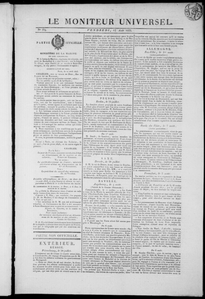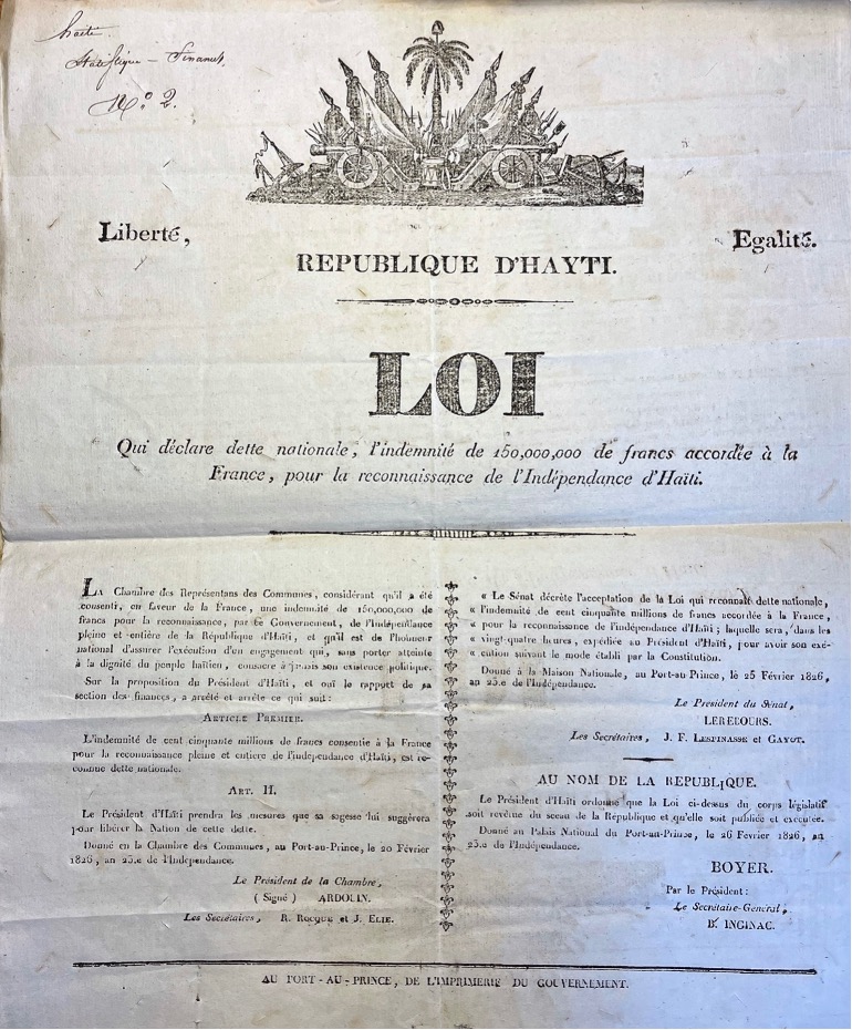 In 1791, the enslaved and free people of color in the French plantation colony of Saint Domingue rebelled. After the spectacular defeat of French, British, and Spanish troops over the next decade, in 1804, the revolutionaries secured independence, renamed their polity Haiti, and abolished slavery within its borders. Finally, after two decades of diplomatic negotiations and several regime changes within Haiti and France, respectively, Haitian President Jean-Pierre Boyer and French King Charles X reached an agreement that resulted in the passage of two separate laws, one in France and the other in Haiti.