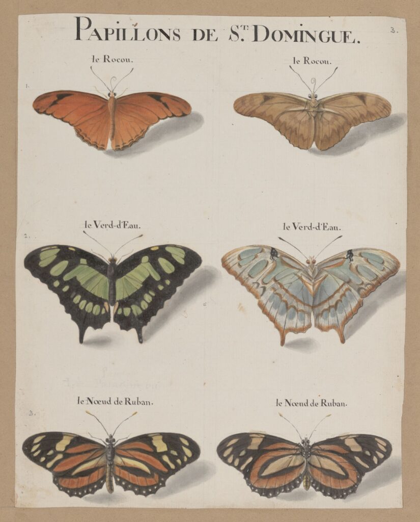 Did De Rabié’s enslaved workers assist him with the gathering of specimens or with the production of his natural history illustrations? While there is no direct evidence in the notes on his drawings, nor in any existing correspondence, it is very unlikely that de Rabié would have been able to acquire specimens or paint and name the plants and animals without the skills and knowledge of many hands, from family members to enslaved servants. When birds were procured by enslaved hunters, the skins were likely prepared by a cook or other enslaved kitchen workers. The fish caught by crews of enslaved fishers were brought back from the market by enslaved servants. The caterpillars plucked off leaves were supplied with fresh food by the gardeners, who may also have captured the butterflies on the wing.[7] Fetching and grinding pigments from the apothecaries, sharpening quills, cleaning brushes, and mixing colors were also tasks often done by enslaved domestic workers. It was not, however, only physical labor that these unnamed assistants supplied. In some cases, they also provided knowledge that de Rabié lacked.