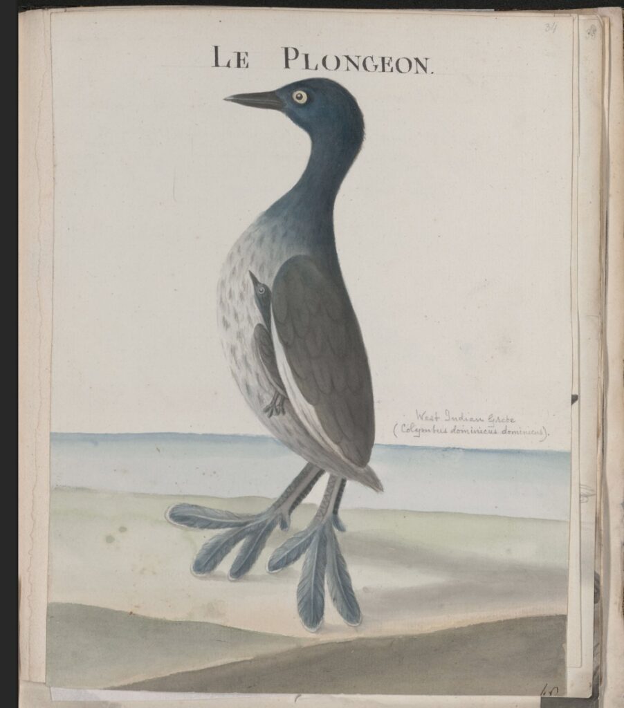 [8] “le plongeon femelle, cet oiseau a un grand amour pour ses petites, [writing trimmed] Elle les cache sous les ailes, en plonger avec ses petits, elle ne les abandon pas mesme dernyer de celle …,” inscription on verso, “Le Plongeon” in Original water-colour paintings on the natural history of St. Domingo, vol. 1, p. 35.